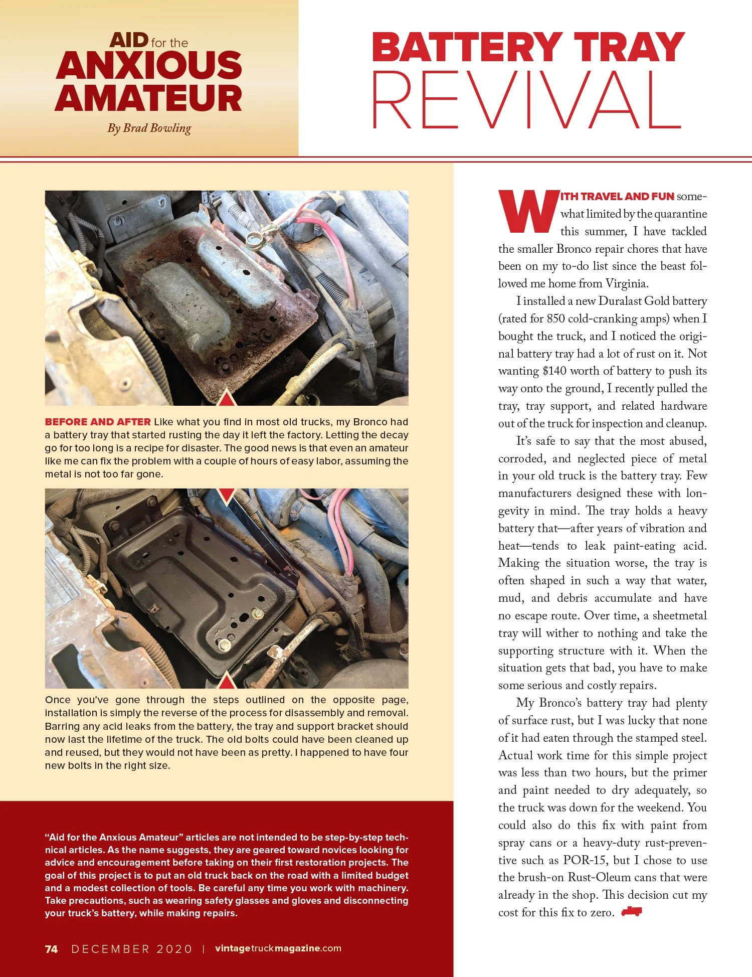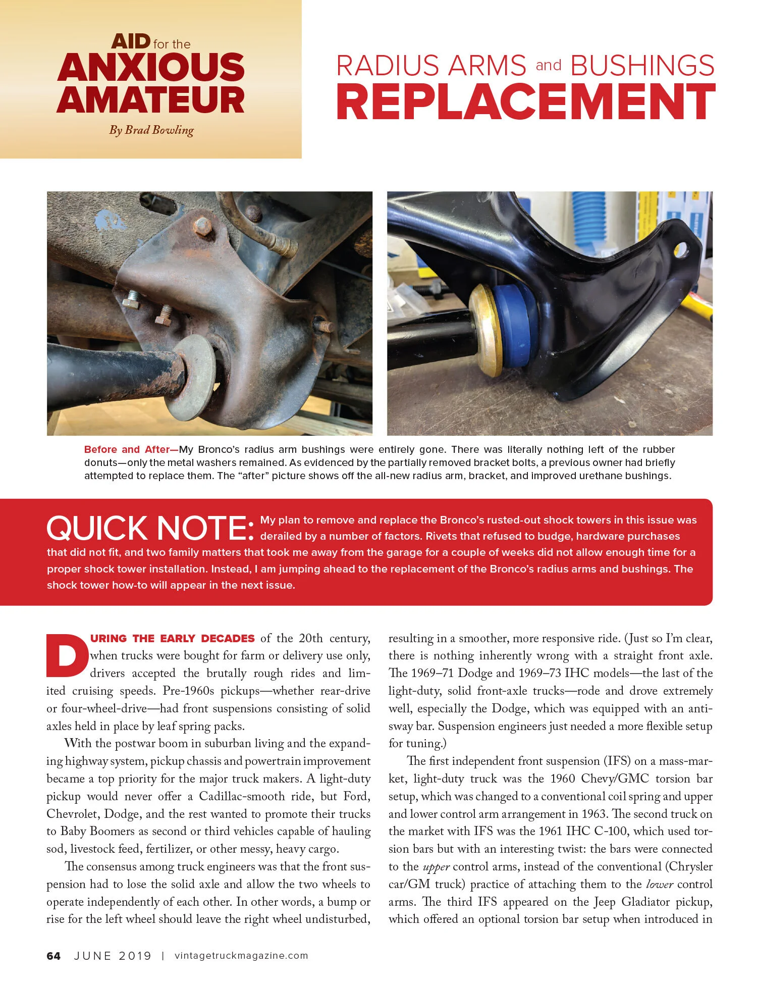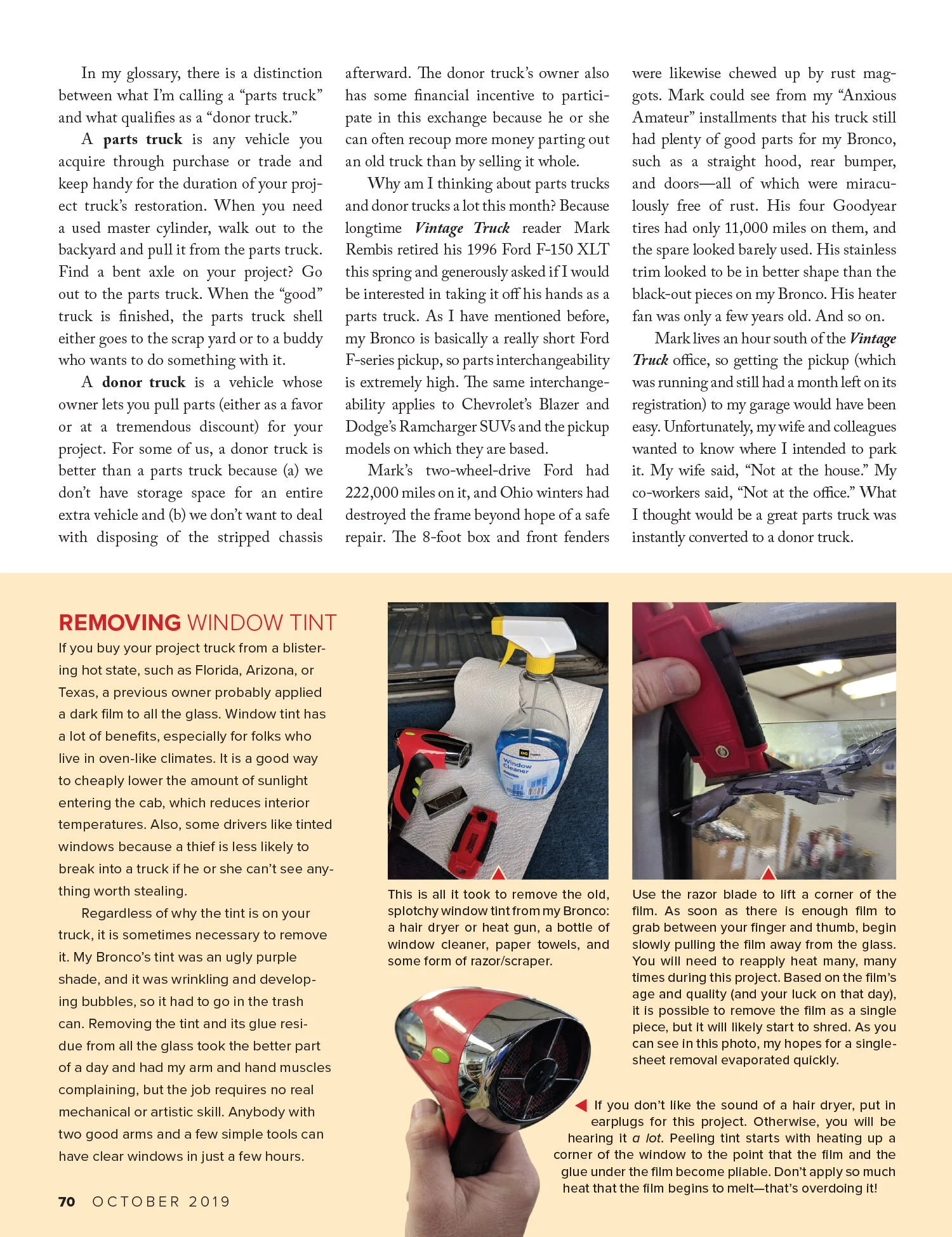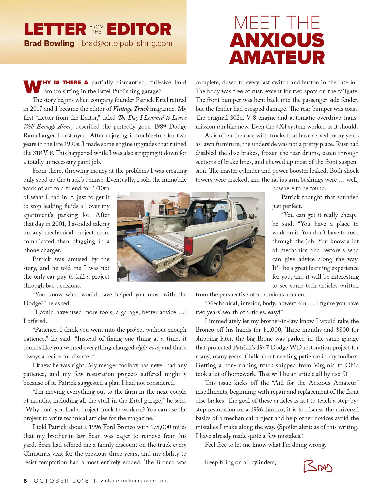 I have been using my 1996 Bronco to write technical articles in Vintage Truck magazine since the September/October 2018 issue. I am also the editor of that magazine. (If, by any chance, you would like to know about about the magazine or subscribe, visit VintageTruckMagazine.com.